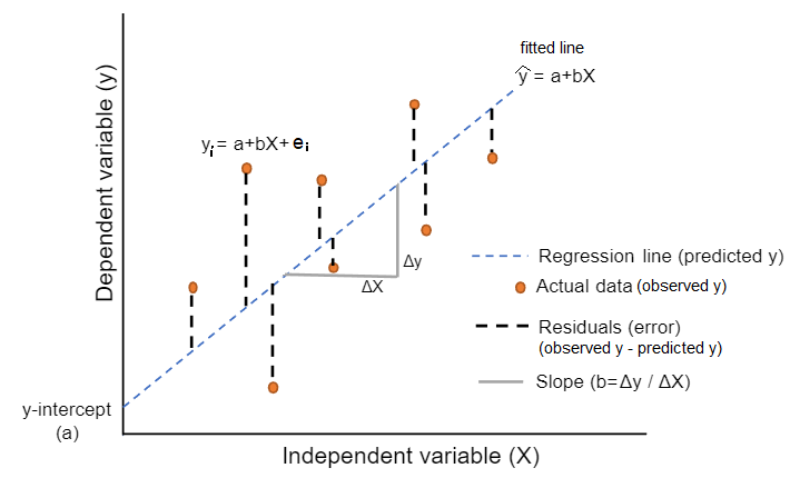 - Residuals \(y - \widehat{y}\), or the error (ε) between the observed value and the predicted value for a given \(x\) value