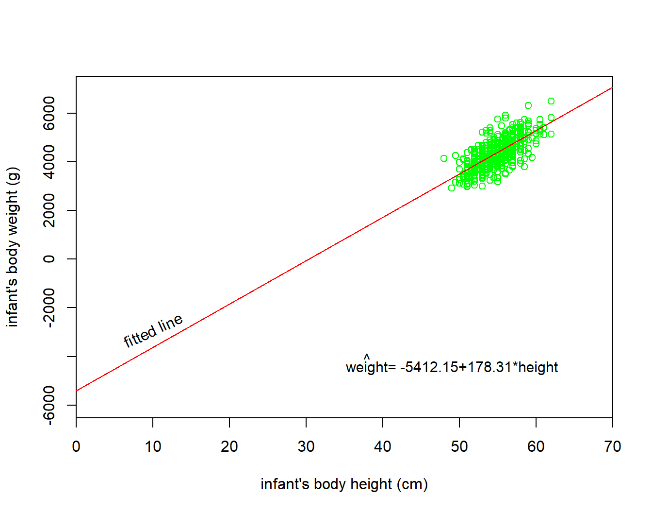 The intercept \(a\) = -5412.15 is the average weight for those infants with height of 0. In graphical terms, it’s where the line intersects the \(y\) axis when \(x\) = 0 (Figure 10.6). Note, however, that while the intercept of the regression line has a mathematical interpretation, it has no physical interpretation here, since observing a weight of 0 is impossible.