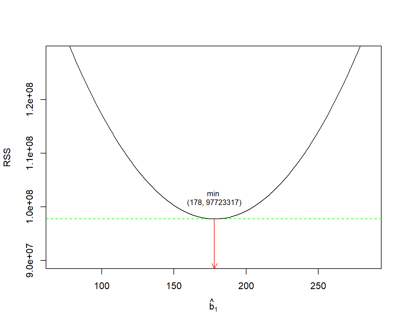 In Figure 10.10, we have found the minimum value of RSS (it turns out to be 97723317) and have drawn a horizontal dashed green line. At the point where this minimum touches the graph, we have read down to the x axis to find the best value of the slope. This is the value 178.