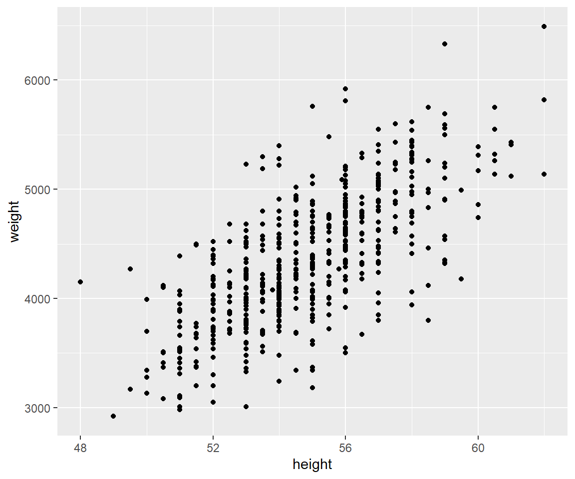 Let’s say that we want to explore the association between height and weight for a sample of 550 infants of 1 month age.