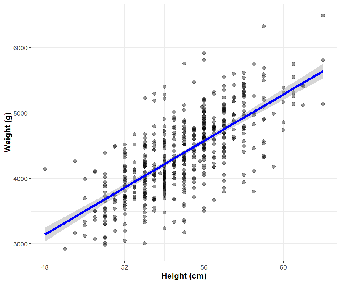 Additionally, note that the sign is positive, suggesting a positive association between these two variables, meaning infants with higher height also tend to have higher weight. Recall from earlier that the correlation coefficient was \(r = 0.71\). They both have the same positive sign, but have a different value. Recall further that the correlation’s interpretation is the “strength of linear association”. The slope’s interpretation is a little different:
