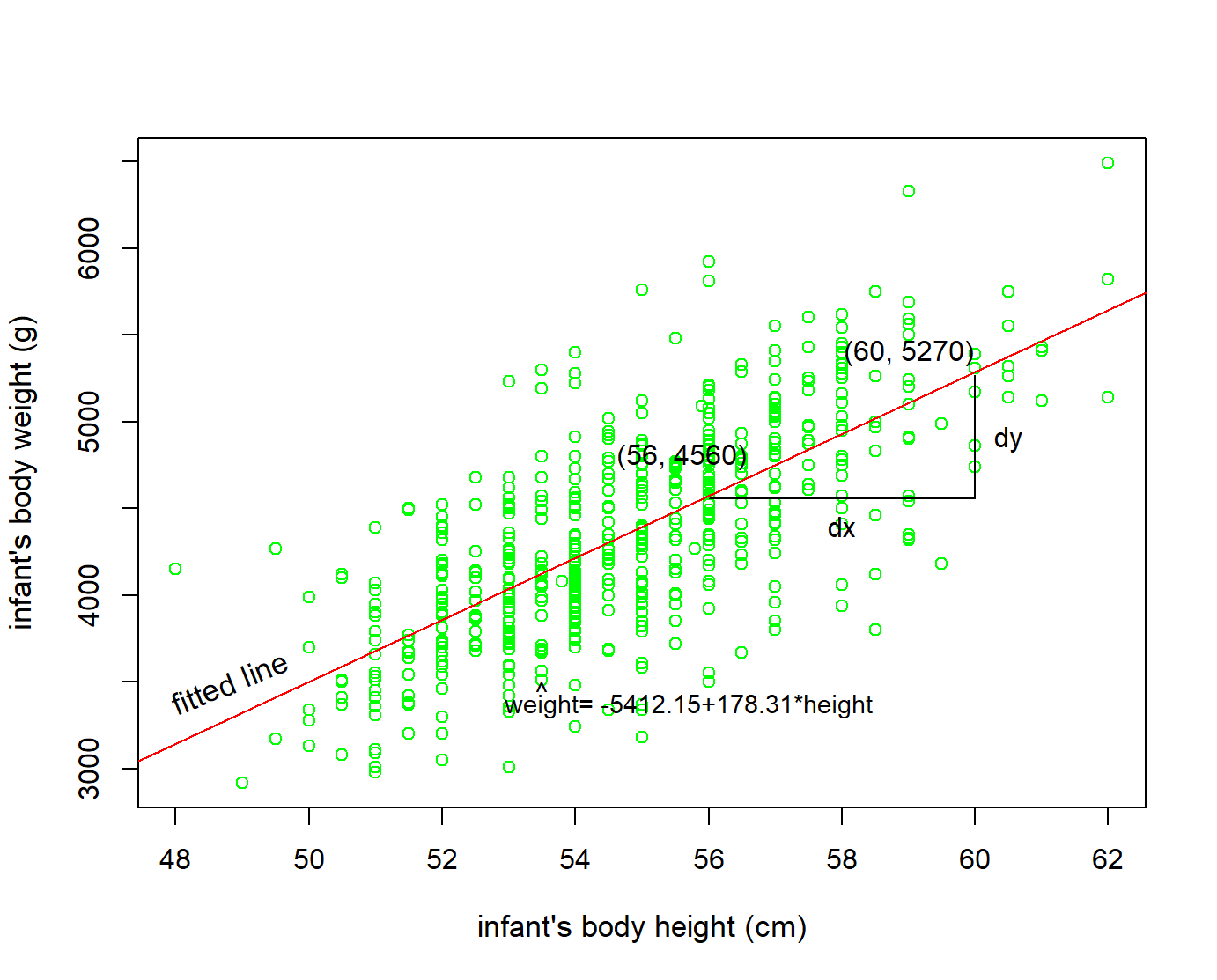 Furthermore, we say that this associated increase is on average 178 g of weight, because we might have two infants whose height differ by 1 cm, but their difference in weight won’t necessarily be exactly 178. What the slope of 178 is saying is that across all possible infants, the average difference in weight between two infants whose height differ by 1 cm is 178 g.